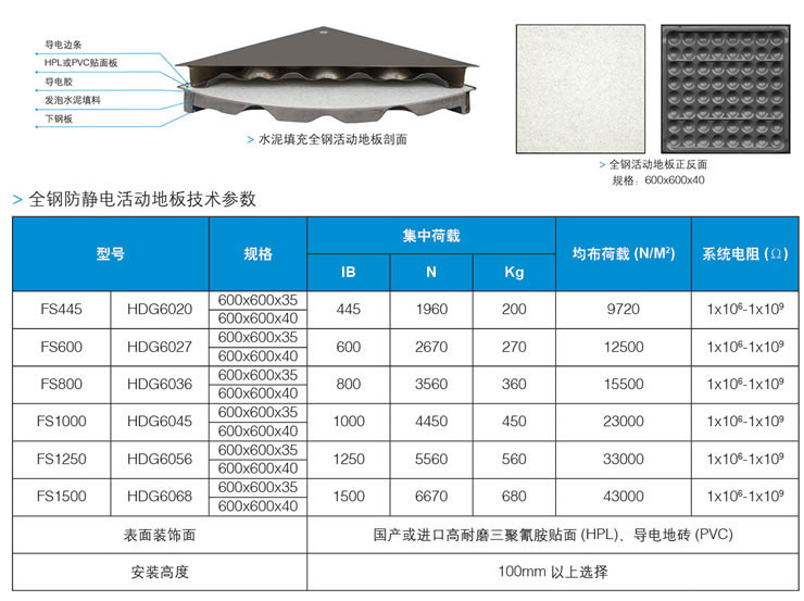 產(chǎn)品特點(diǎn): 1、全鋼組成,機(jī)械強(qiáng)度高,承載能力強(qiáng)、防火性能好; 2、表面靜電噴塑、柔光、耐磨、防腐蝕; 3、粘帖的裝飾高壓層板,耐磨性及防靜電性能優(yōu)良,抗污染、便于清洗、裝飾性強(qiáng); 4、尺寸精度高、互換性好、組裝靈活、維修方便; 5、公司新品 600*600*40 型號,機(jī)械荷載強(qiáng)度大大提高,是傳統(tǒng)規(guī)格 600*600*35 所無法比擬的。